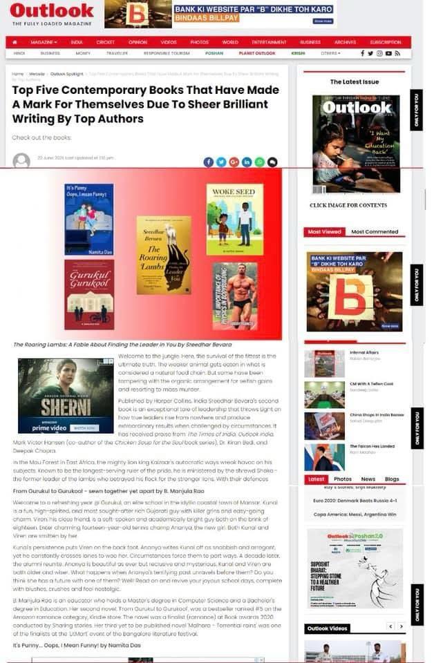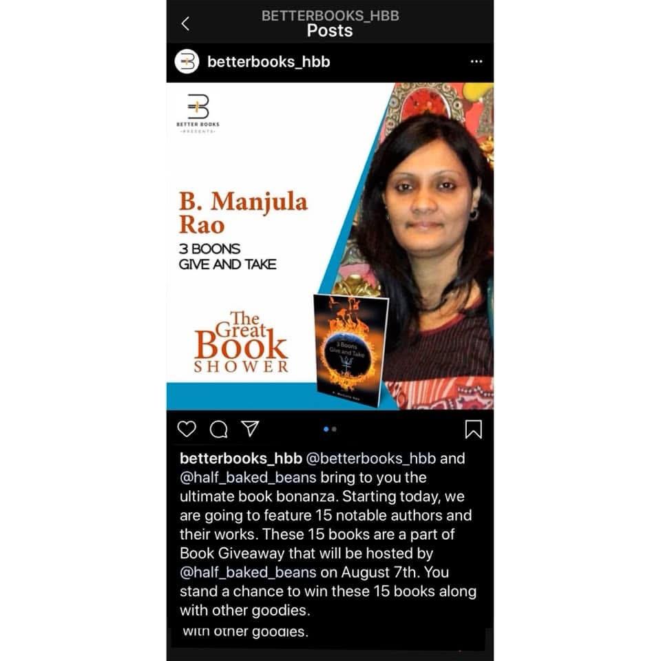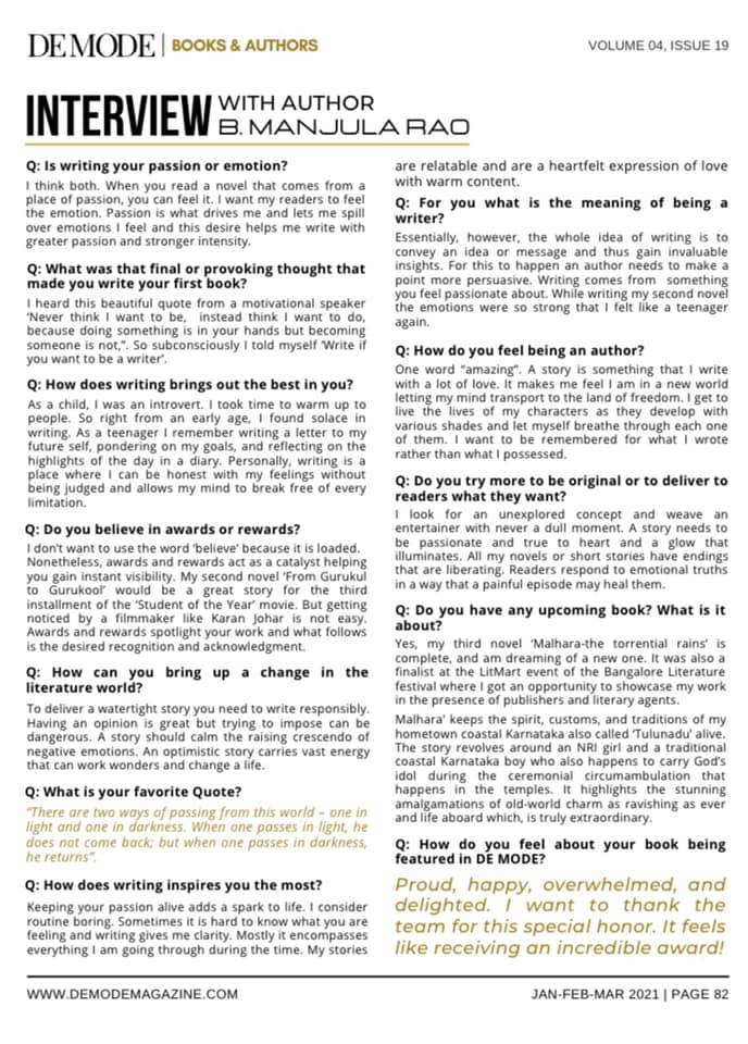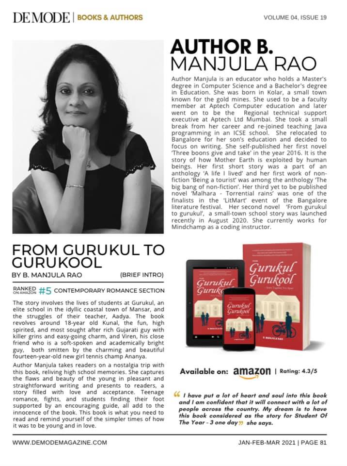 Manjula Rao made her literary debut in 2016 with her self-published novel Three Boons: Give and Take (Partridge India). Her second novel, From Gurukul to Gurukool (2020), a small-town school story, was published by Paper Towns. Her short fiction has appeared in the anthology A Life I Lived, while her non-fiction work Being a Tourist was featured in The Big Bang of Non-Fiction. Her third novel, Malhara – A Return to Roots, Where Love Awaits, was a finalist at the LitMart event of the Bangalore Literature Festival.